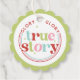 Cette étiquette ludique présente le dicton "Gloire, histoire vraie" avec alternance de couleurs et d'accents scintillants. Les couleurs sont rose, rouge, vert et bleu clair.