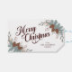 Cette étiquette cadeau de Noël affiche en évidence l'expression "Joyeux Noël" dans une grande police de caractères élégante apparaissant dans une couleur bordeaux foncé. Les coins du tag sont décorés d'un agencement botanique hivernal, avec des cônes de pin, des branches de sapin, des tans doux et du feuillage turquoise, ce qui lui donne une atmosphère de vacances cosy. Personnalisez cette étiquette cadeau de vacances avec votre nom.