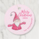 Créez des étiquettes festives de Noël rose avec le dicton "Joyeux Noël" et une illustration de gnome mignon customisée avec votre nom de famille et votre année. Utilisez le modèle pour les personnaliser facilement.