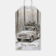This Christmas gift tag features a vintage pickup truck driving through snowy woods with a decorated tree in the back, brimming with classic holiday charm. The front reads Merry Christmas in festive script, and the back includes lines for To and From. A nostalgic design that brings a rustic, heartfelt touch to your gift wrapping; perfect for pairing with kraft paper, twine, or ribbon and ideal for fans of farmhouse or traditional Christmas style.