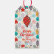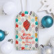 Étiquettes de cadeau personnalisées Joyeux Noël ou faveurs comportant des ornements de Noël vintage en rouge, or, violet, turquoise et menthe ainsi que votre message et votre nom en lettrage chic. Cartes d'invitation, assiettes, serviettes, sacs cadeaux et plus assortis dans notre magasin.
