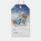 Ces adorables étiquettes cadeaux de Noël comportent un ours couché en hibernation dans une chaise à bascule confortable. À l'arrière, il y a un arrière - plan bleu avec la neige qui tombe.