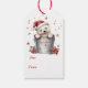 L'image mignonne sur cette étiquette cadeau de Noël est celle d'un adorable petit ourson polaire portant un casquette du Père Noël rouge et blanc. Le petit ours est sorti d'un seau en bois, avec des étoiles dorées tout autour. Le texte stylisé en bas sur le devant dit "Joyeux Noël" en vert et rouge. Le dos de la balise a la même image d'ours, avec votre texte personnalisé.