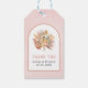 Feuilles tropicaux de palmiers séchés, pampas herbe et fleurs de protéa doux arche rose Merci botanique étiquettes cadeau mariage. Ce joli design mariage présente un cadre en arc sur un arrière - plan couleur rose vif. Dans le cadre il y a un bouquet de feuilles de palmiers séchés, des fleurs de protéa et de l'herbe de pampas.