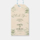 C'est un modèle d'étiquette de cadeau de mariage élégant avec du feuillage vert poussiéreux sur une texture de papier craft beige. Typographie élégante et personnalisable en vert foncé. C'est un design sophistiqué et classe que vous pouvez modifier le texte, les images et les polices. Ce design évoque une élégance simple et organique.