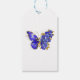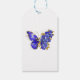 Bijoux, bleu, saphir, papillon aux fleurs pétillantes avec aile décorée de bleu, fleurs précieuses avec feuilles d'or sur arrière - plan blanc.