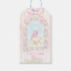 This Christmas gift tag features pastel nativity scenes of a Mary with baby Jesus in a manger. There is a light pink striped background.