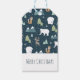 Joyeuses étiquettes cadeaux de Noël avec un motif fantaisiste festif. Ours polaires, rennes, arbres, renards et flocons de neige. Sur un arrière - plan vert foncé.