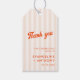 Peach et tangerine remercient étiquettes cadeaux, conçu pour ajouter une touche de charme rétro à votre journée spéciale. L'arrière - plan à rayures pêche douce est parfaitement complété par la typographie rétro tangerine vibrante qui ajoute une pop de couleur et de sophistication. Le texte est entièrement personnalisable.
