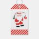 Pécheur créatif étiquettes cadeaux de vacances, avec le Père Noël drôle tenant une canne de pêche avec un ornement de Noël sur le crochet.