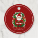 Autocollant coloré de style cartoon. Père Noël rouge entouré de branches de sapin ornées de cadeaux et de décorations.