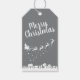 Cette élégante étiquette cadeau de Noël gris argenté présente la silhouette de Père Noël en train de avec ses rennes, volant au-dessus des maisons dans une traînée d'étoiles. Le texte des deux côtés, dans une police blanche et moderne, est entièrement personnalisable.