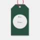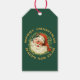 Voici un portrait rétro et élégant de Père Noël sur une étiquette cadeau colorée ! Il porte son casquette traditionnel et, bien sûr, sa fameuse barbe. Son casquette est décoré d'une branche de saint. Des aiguilles en pin entourent le portrait. Un texte en or brillant dit Joyeux Noël et Bonne Année. L'arrière de la balise a une bannière de cercle blanche avec votre texte personnalisé sur le même arrière - plan vert. *Veuillez noter que l'image est imprimée et ne contient pas de parties scintillant réelle.*