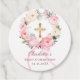A white background, decorated with watercolored pink and ivory flowers in a wreath and a golden cross. A pink bow. Personalize and add the name and date.