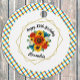 Plaques de papier de fête d'été avec le thème floral tournesol, cadre géométrique or et frontière colorée rouge, jaune et bleu