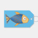 Ensemble de 10 étiquettes cadeaux rectangulaires avec une image d'un poisson blanc bleu et jaune avec des branchies orange et une bordure orange sur le bleu. Le dos est bleu avec du texte personnalisable. Voir confettis assortis, autocollant vinyle cousu sur mesure et papier d'emballage. Voir l’ensemble de la collection d’étiquettes de cadeaux et de faveurs du coin des enfants dans les TOUCHES SPÉCIALES | Section Favoris.