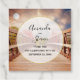 Balises de mariage avec une photo pittoresque. Un pont en bois qui mène à un chemin entouré d'arbres forestiers qui changent de couleur. Couché sur le dessus est un cercle semi-transparent avec une bordure en or, votre texte personnalisé à l'intérieur.