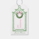 Cette étiquette de Noël présente un design Préparatifs de Noël en style chinoiserie avec un cadre de pagode en bambou vert orné d'une couronne de Noël avec un nœud rose. Le bas comporte un texte vert qui dit "Fabriqué à la main par" Vous pouvez personnaliser avec un nom et votre initiale. Le dos présente un motif coordonné.