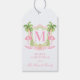 This Christmas gift tag has a preppy design featuring a Christmas crest with palm trees and flamingos wearing Santa hats. The bottom has pink text that says "Merry Christmas." You can personalize with a name, year and your initial.