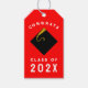 Étiquettes de cadeau de fin d'études avec la promotion de '26, félicitations au diplômé et motif de toque noire classique avec gland doré sur fond rouge. Modifiez le texte pour ajouter l'année de la promotion ou le nom du diplômé.