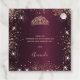 Pour un élégant Quinceañera, 15ème anniversaire. Une couleur arrière - plan à l'aspect faux métallique bordeaux. Décoré avec de la poussière de parties scintillant en faux or rose et une tiare, couronne. Personnalisez et ajoutez un nom, un âge et une date. Quinceañera est écrit avec un script de style moderne écrit à la main avec des swashes. Retour : ajoutez une note de remerciement et votre nom.