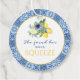 Étiquettes de remerciement de douche de mariage à l'aquarelle bleue et jaune avec fleurs de citron. Carreaux méditerranéens italiens bleus avec le texte Elle a trouvé son coup de cœur.
