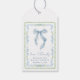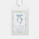 Étiquettes de remerciement de cadeau de fiançailles chic et fantaisistes avec un cadre à l'aquarelle floral bleu et vert vintage grandmillénaire, un ruban bleu élégant et "amour + merci" dans une écriture calligraphique bleue.