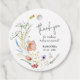 Des étiquettes de faveur rondes de baby shower de mariée blanches élégantes présentent des fleurs sauvages aquarelles élégantes, merci, votre nom et la date du shower dans une écriture chic. ARTICLES correspondants dans notre collection.
