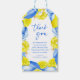 Ajoutez une touche joyeuse et élégante à vos cadeaux de remerciement de mariage avec ces étiquettes de remerciement sur le thème des citrons bleus et jaunes. Avec leurs citrons aquarelles, leur feuillage et leurs accents de carreaux inspirés de la Méditerranée, ces étiquettes sont parfaites pour attacher aux sacs de cadeaux, aux bougies ou aux petits cadeaux. Idéal pour les fêtes dans les jardins toscans, les célébrations de mariage sur le thème des agrumes et les mariages d'été. Personnalisez-les avec le nom de la mariée ou un doux message pour une touche finale élégante.