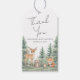 « Merci » est inscrit en haut de cette jolie étiquette de remerciement pour cadeau de fête prénatale sur le thème de la forêt. Le design présente une scène aquarelle douce avec des animaux de la forêt — un cerf, un renard, un raton laveur, une souris et un hérisson — rassemblés dans une prairie paisible entourée de grands pins.