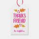 Ajoutez la touche finale parfaite à vos cadeaux de Friendsgiving avec cette étiquette de cadeau rose et or ludique. Avec des feuilles d'automne et des lettres « Thanks Friend » joyeuses, elle se coordonne avec vos invitations et accessoires de Friendsgiving Feast.