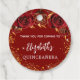 Une étiquette de faveur fillette et tendance pour une Quinceañera, 15ème anniversaire. Un élégant arrière - plan rouge décoré de fleurs rouges et d'une robe dorée. A l'avant : Le texte : Merci est écrit avec un grand script de style à la main tendance. Retour : Le texte : le Merci d'être venu. Personnalisez et ajoutez un nom et un événement/texte.