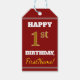 Cette marque cadeau d'anniversaire comporte un message comme "HAPPY 1st BANTHDAY, FirstName !", où le nom peut être customisé, et où le numéro "1st" a une apparence de couleur fausse/imitation or. L'avant est également orné d'un arrière - plan de couleur rouge. L'arrière comporte une ligne "De :". Des étiquettes cadeaux d’anniversaire comme celles-ci pourraient peut-être être utilisées pour les cadeaux offerts pour le premier anniversaire de quelqu’un. [~Z0000207]