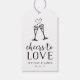 Envoyez à vos invités à la maison du vin, du champagne ou des petites bouteilles de leur libation préférée ? Attachez ces étiquettes doucement chic pour une touche personnelle. Les étiquettes Favor comportent une paire de flûtes de champagne jointes par un coeur effervescent, avec "cheers to love" dans le script de calligraphie et la typographie de bloc vintage. Customisez ces étiquettes noires et blanches fantaisistes mais élégantes avec vos noms et date mariage.