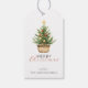 Une simple étiquette de cadeau rustique comporte un arbre aquarelle dans un panier avec décoration. Associée à une typographie moderne et script