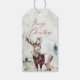 Ajoutez un accent enchanteur à vos cadeaux et forfaits de vacances avec cette aquarelle rustique paysage de neige d'hiver. Il présente un cerf en bois habillé en style vacances avec un pull en laine rouge foncé et une guirlande de poinsettias blanches autour du cou. Style vintage manuscrit type visage épelle "Joyeux Noël" dans le texte rouge canneberge. Le verso de cette balise a un modèle de texte avec le texte "à" et "de". Vous pouvez conserver ce texte comme indiqué, ou personnaliser avec votre propre texte souhaité.