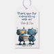 Ajoutez une touche de charme robotique à vos faveurs de fête avec cette adorable étiquette cadeau ! 🤖 💛 L'avant présente une illustration fantaisiste d'un couple de robots tenant une boîte intitulée "Baby : some Assembly Required", ainsi que le message "Merci pour célébrer avec nous !" - entièrement personnalisable avec votre propre texte, signature ou date de l'événement. 📝 Le dos présente des pièces robotisées colorées, motifs en bleu, gris et jaune pâle, associant votre thème avec un style ludique et futuriste. ⚙️ 🎉