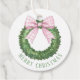 Cette étiquette a une couronne en bois de boxe Preppy avec un arc en vichy rose. Ci-dessous, en vert arrondi, on peut lire "Joyeux Noël".