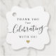 Écriture minimaliste moderne "merci de célébrer avec nous" et couleur de forme de coeur modifiable avec les noms de couple et la date de l'événement sur le dos, simple et élégant. grande étiquette de faveur personnalisée. Voir toutes les pièces correspondantes de la collection