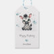 Étiquette de cadeau de fête prénatale ou d'anniversaire pour bébé mignonne avec un petit zèbre mâle adorable et des cœurs d'amour bleus