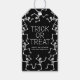 Ajoutez une touche spéciale à vos faveurs Halloween et trichez ou traitez des sacs avec ces étiquettes cadeaux Halloween éffrayantes! Le design comporte une bordure de squelettes dansants avec "Trick or Treat" en lettres blanches. Personnalisez l'avant des étiquettes cadeaux squelettes avec votre message d'accueil personnalisé, votre nom ou tout autre texte personnalisé. L'étiquette cadeau de la ruse ou du traitement inverse pour afficher un motif osseux noir et blanc.