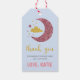 Cette petite étoile scintillante mignonne et élégante" premier anniversaire merci de préférence tag caractéristiques bébé bleu arrière - plan avec faux or et rose étoiles de parties scintillant et nuages.