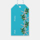 Sur le thème de la plage, cravate de Noël sur étiquettes cadeaux en bleu aqua avec étoiles de mer et conception sainte. Les étoiles de mer blanches et les saints verts font une bordure le long du fond avec le texte blanc optionnel, "pour et de" qui peut être changé ou retiré. L'arrière des étiquettes a une plus grande étoile de mer et une image de saint-jacques. Choisissez une couleur de fil.