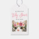 Balises cadeau pour baby showers au thème du chat avec un script rose blanc et un chat aquarelle peint avec des fleurs roses et mauves près du fond du design. Personnalisez les étiquettes-cadeaux de baby shower sur le thème du chaton avec le nom et la date de la future mère du baby shower. L'arrière de la marque cadeau présente un design pointillé rose et blanc.