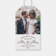 Envoyez des vœux de fêtes joyeuses en tant que nouveaux M. et Mme ! Ajoutez une touche finale élégante aux cadeaux de Noël et aux faveurs de fête de fin d'année avec des étiquettes de cadeaux photo de jeunes mariés élégants. L'image et tout le texte de ce modèle sont faciles à personnaliser. Le design moderne minimaliste noir et blanc présente une typographie de script manuscrit tendance et une photo de mariage de votre choix. La famille et les amis adoreront cette étiquette personnalisée chic. Vœux chaleureux pour un à jamais joyeux !