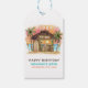 Les étiquettes cadeaux d'anniversaire Tiki comprennent une aquarelle Tiki bar sur la plage au coucher du soleil avec des palmiers, des lampes à cordes, des torches de tiki et un accueil hawaïen "Aloha". Cocktails tropicaux, ananas, hibiscus et feuilles de palmiers, planches de surf et perroquet dans un casquette pirate décorent l'espace bar. Art par KL Stock