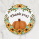 Étiquette de remerciement à thème citrouille et tournesols avec une illustration d'une citrouille dodue posée dans un champ de tournesols et de jolies fleurs jaunes et vert menthe avec des brindilles de baies pleines de baies orange. Étiquette de remerciement parfaite pour les baby showers d'automne, les douches de mariée d'automne et les fêtes d'anniversaire sur le thème des citrouilles.
