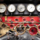 Les conducteurs de train à vapeur ont une vue depuis la plaque de marche des jauges et des commandes du train.