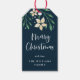 Les étiquettes cadeaux de Noël festifs présentent "Joyeux Noël" en écriture calligraphie blanche avec des lettres accentuées avec des fleurs poinsettia couleur ivoire crème et le feuillage botanique vert sur un arrière - plan bleu minuit. Personnalisez avec vos noms ou salutation personnalisée en dessous. Vide à l'envers pour écrire à la main le nom du destinataire du cadeau.
