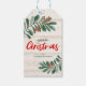 Cette étiquette cadeau de Noël à thème rustique présente un graphique de la verdure de Noël et des baies sur un arrière - plan rustique en bois clair. Personnalisez avec votre nom.